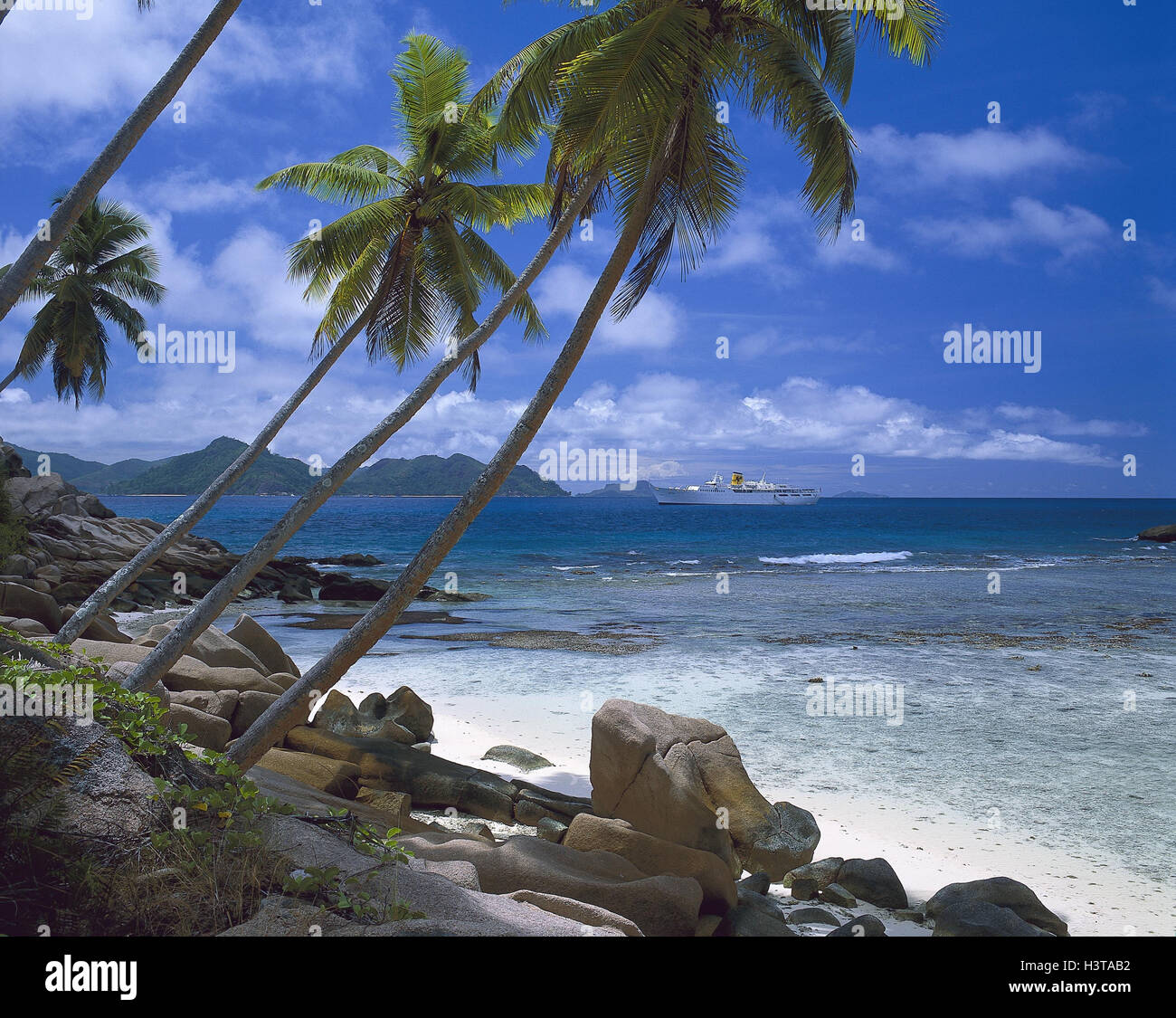 La Seychelles La Digue Palm Beach Mare Bay La Nave Di Crociera Oceano Indiano Isola Isola Da Sogno Costa Rock Spiaggia Palme Vacanze Vacanza Da Sogno Sogno Spiaggia Mare Nave Nave Passeggeri